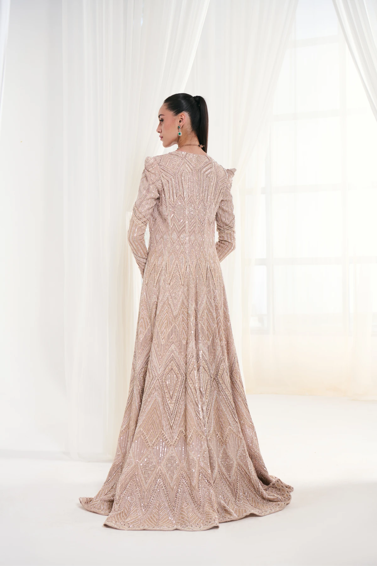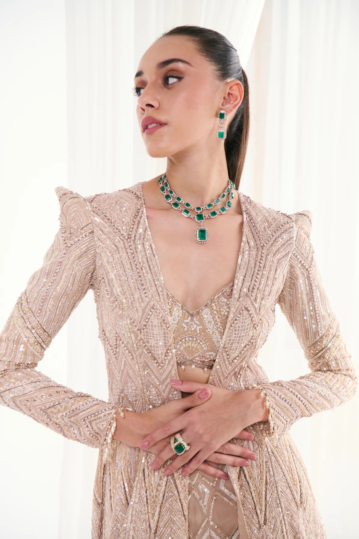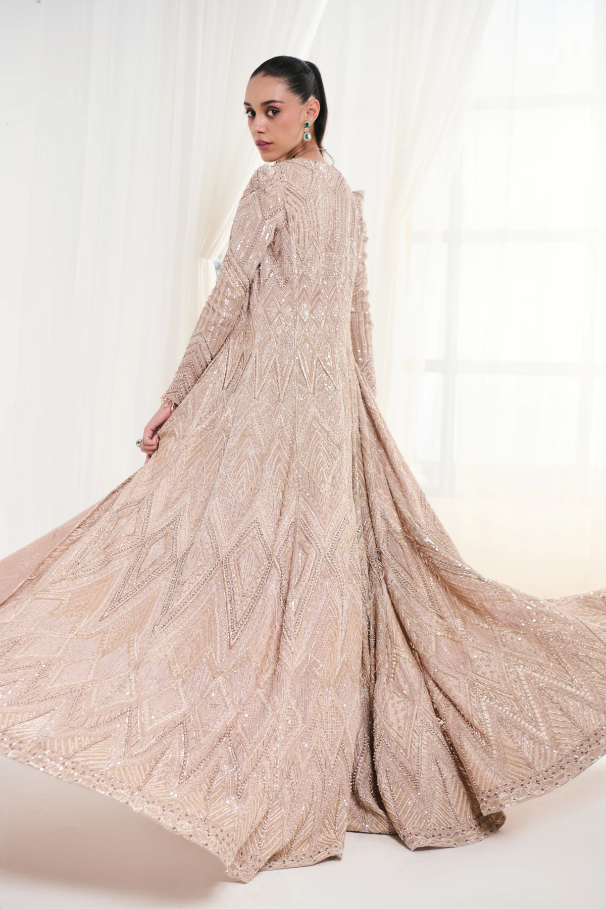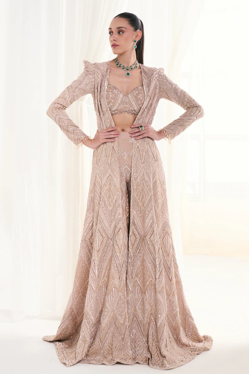 This peach ensemble features pearl and sequin-embellished georgette trousers and a tassel-detailed bustier, exuding sophisticated elegance and timeless grace.
