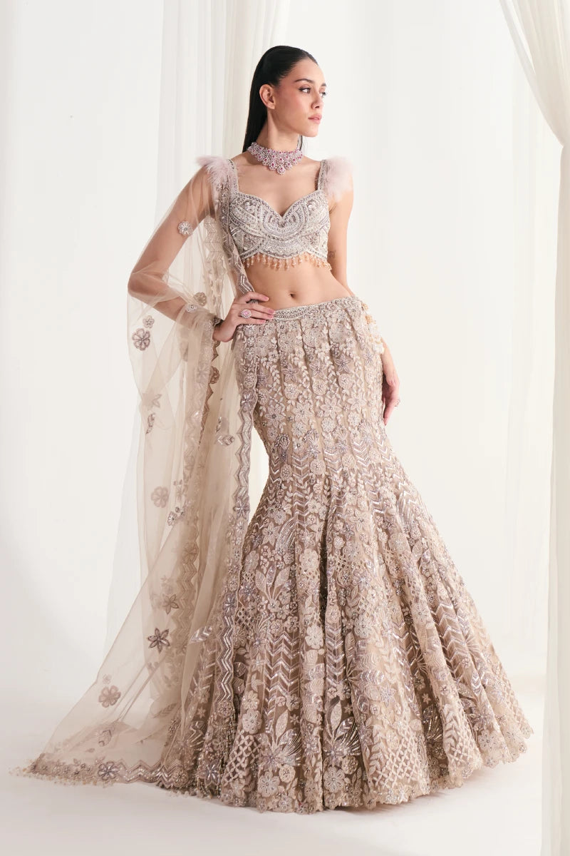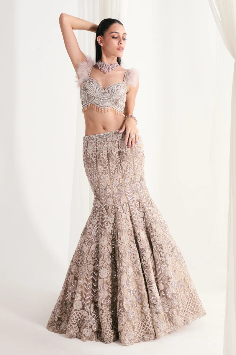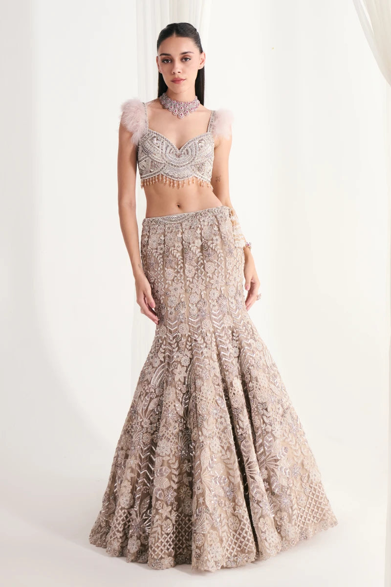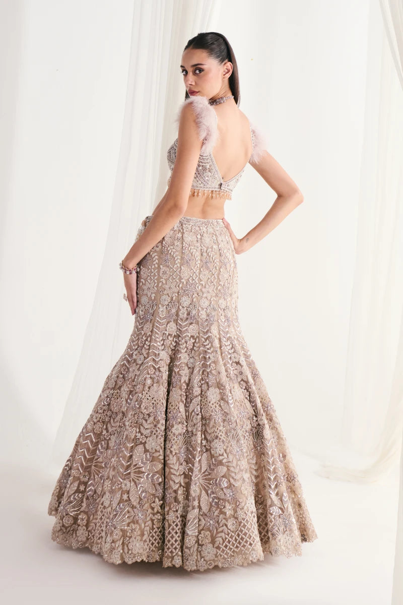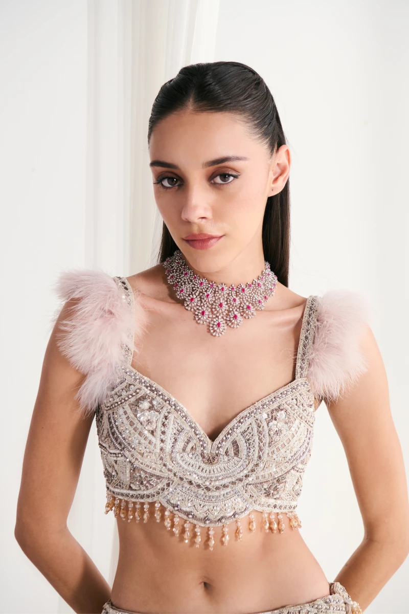 This enchanting net blouse features luxurious feathers and intricate gotta dorri work, blending dramatic elegance with a rich, airy texture.