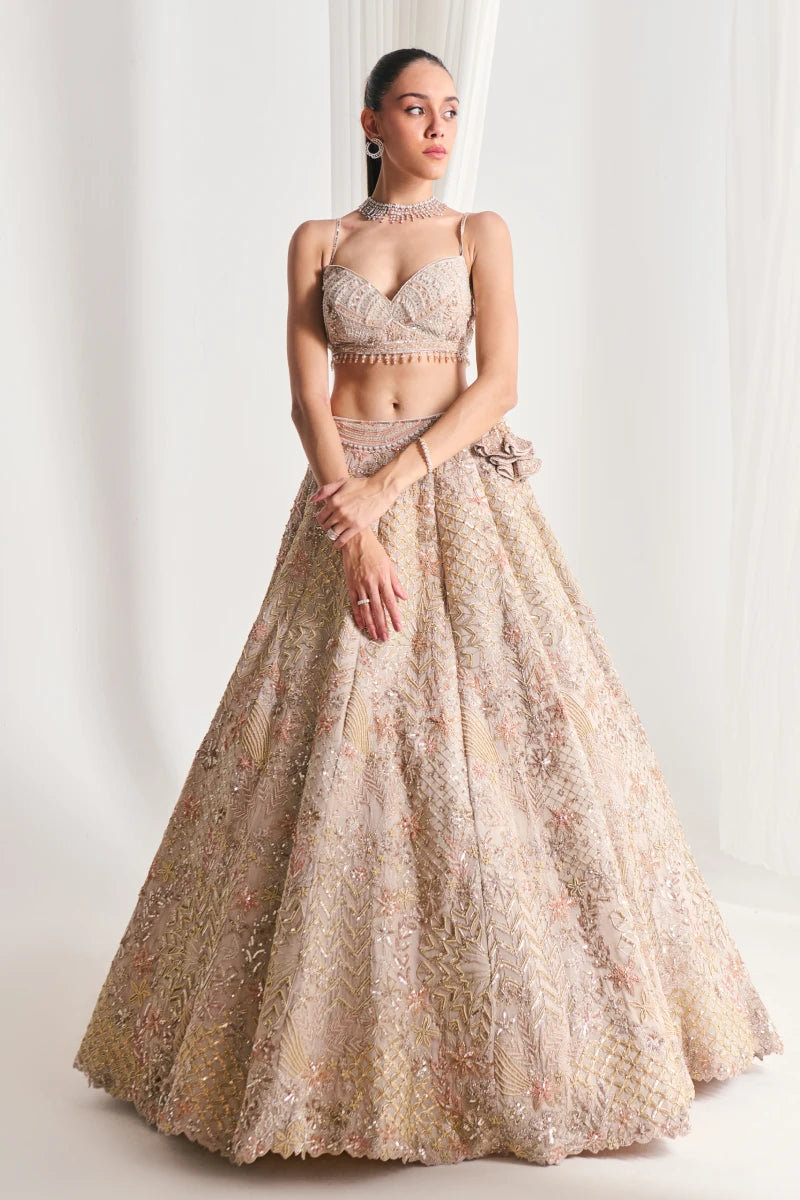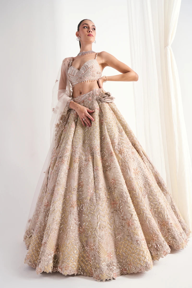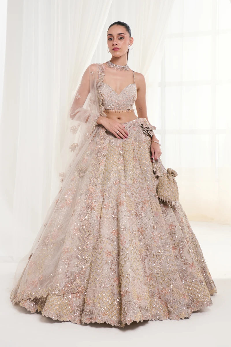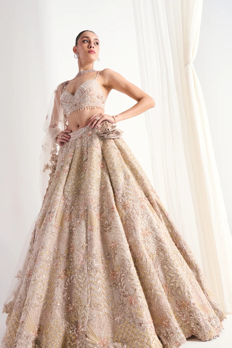 This beige ensemble features thread work, Tush, and shimmering sequence on flowing georgette, with a net dupatta adding ethereal charm and modern sophistication.