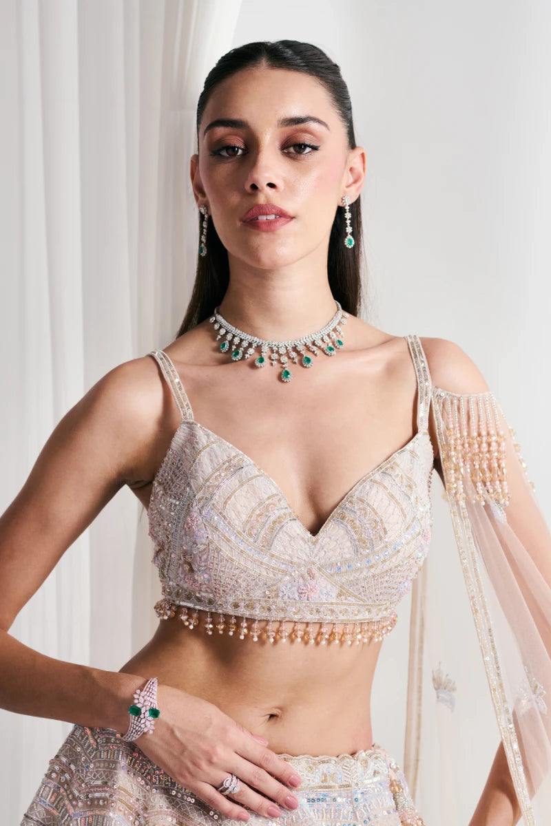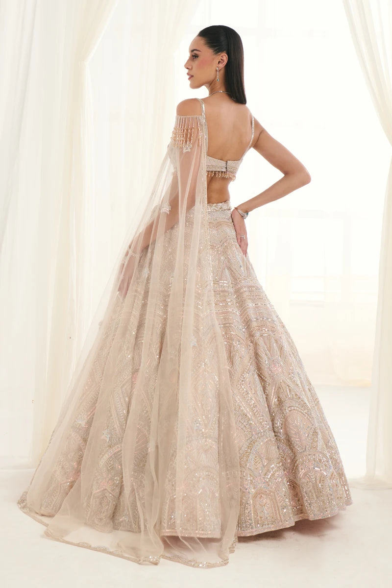 This design showcases vibrant Rainbow Sequence, Cutdana, and Nalki work, creating a dazzling, textured effect. The one-sided dupatta blends modern elegance with traditional artistry.