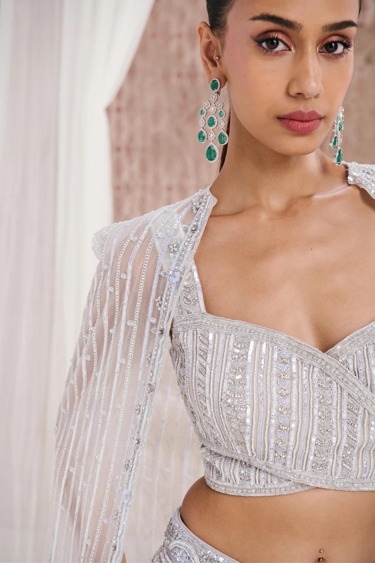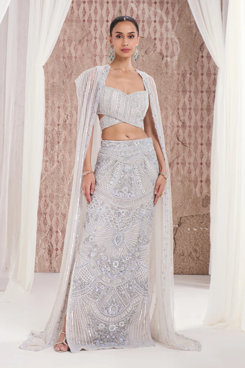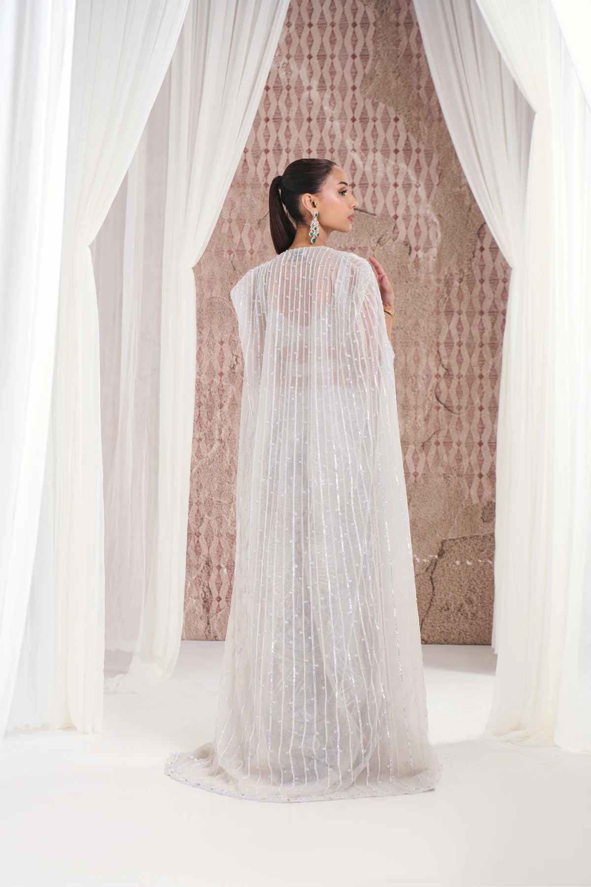 This ivory ensemble features a delicate net cape and chic slit skirt, exuding refined elegance with a modern, ethereal silhouette.