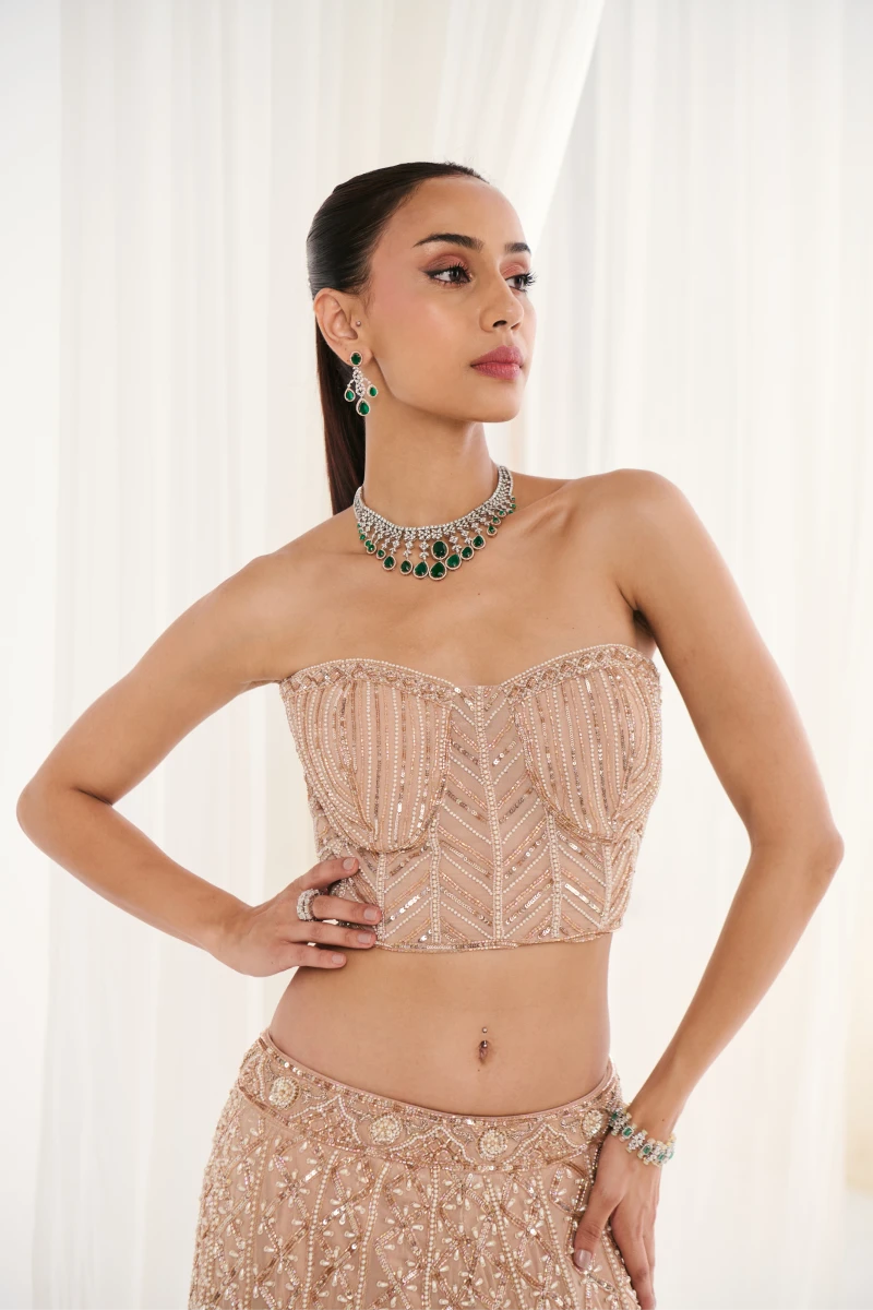 This soft peach design features pearls and sequence work on luxurious georgette, offering elegance and a timeless, refined aesthetic.