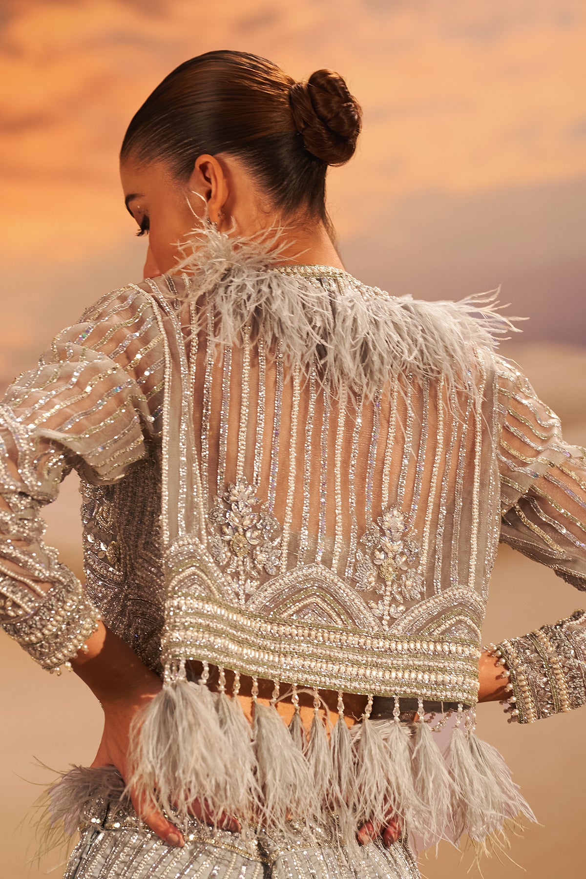 Ice Grey Hand-embroidered Jacket Set, a Mesmerizing Ensemble With Sequin, Mother of Pearl and Cutdana Work Along With Feather Detailing on Shoulder and Jacket Sleeves.