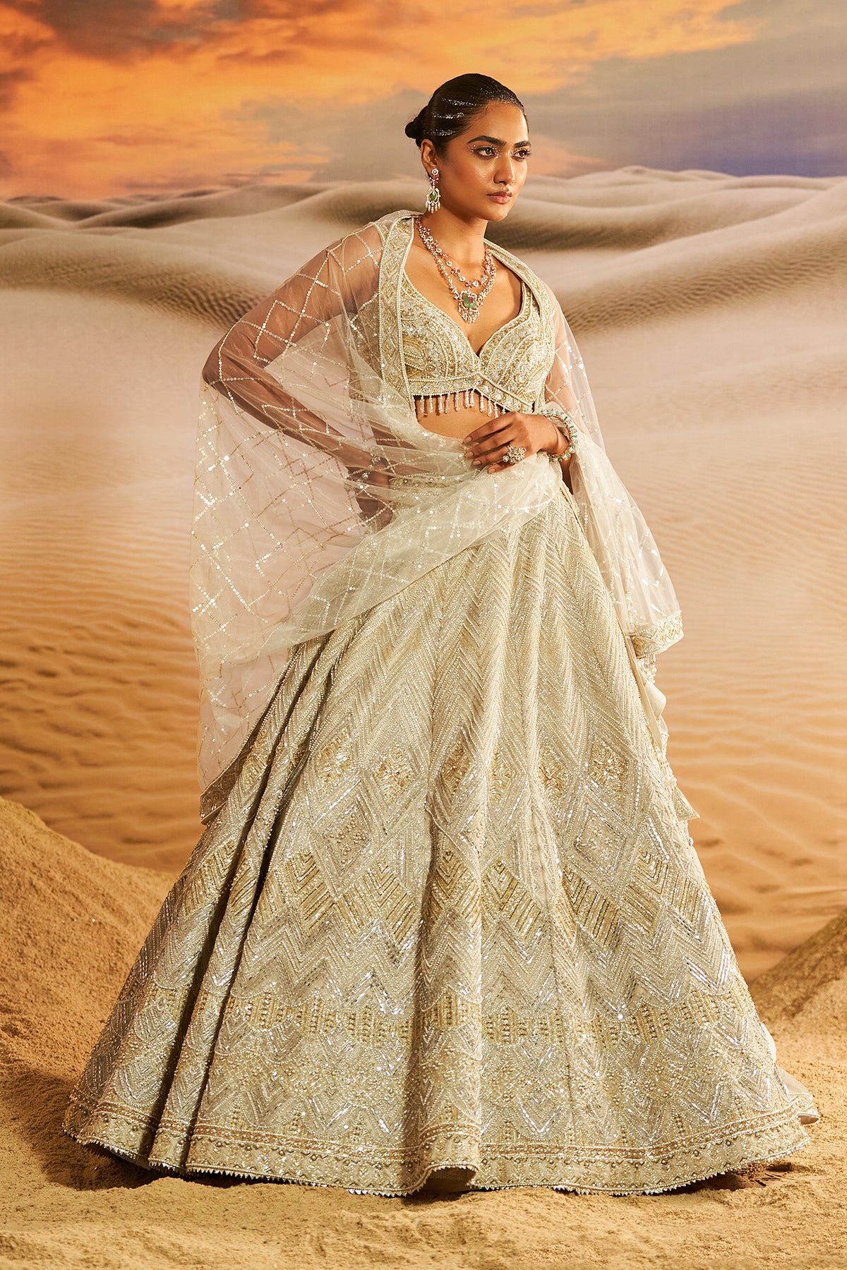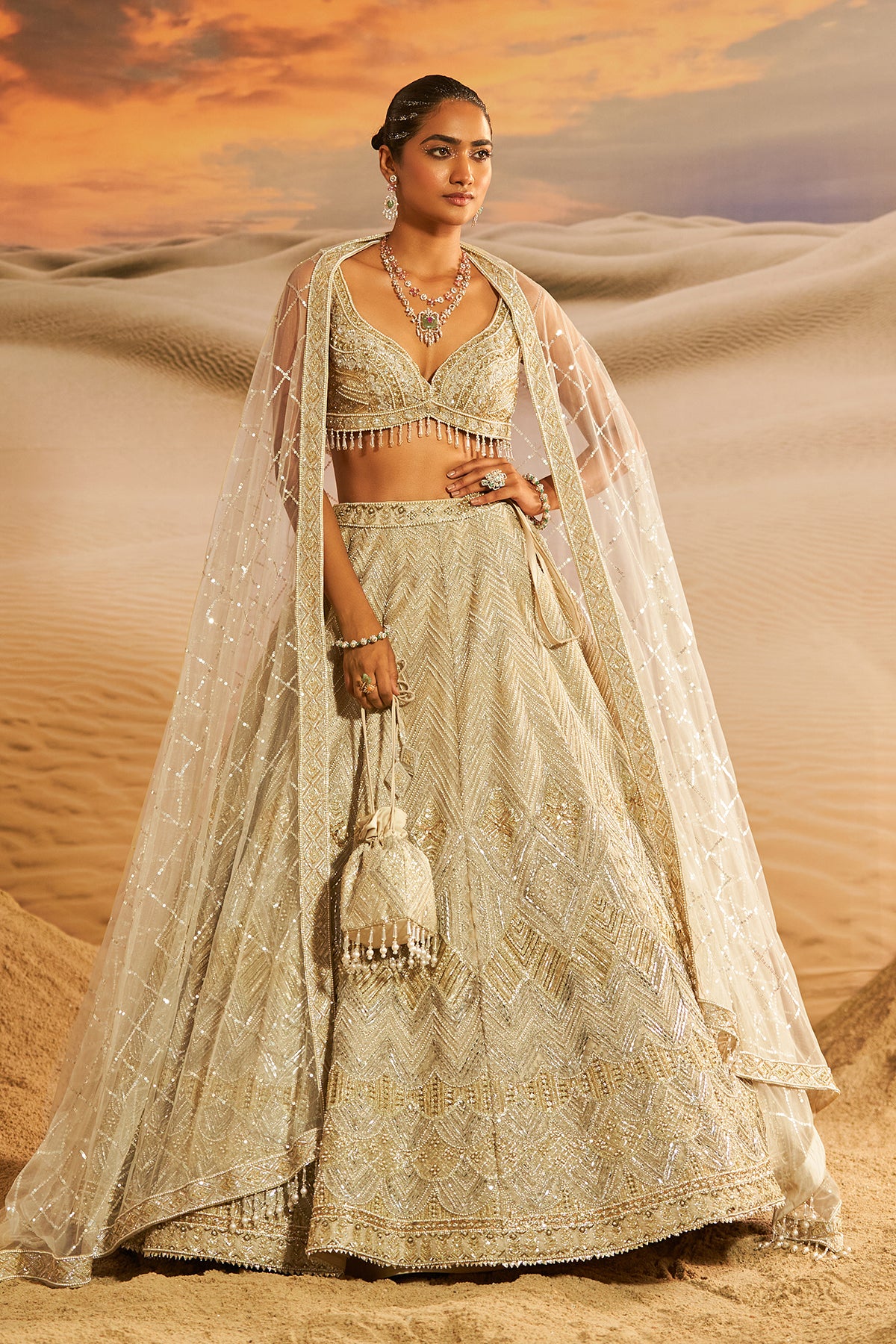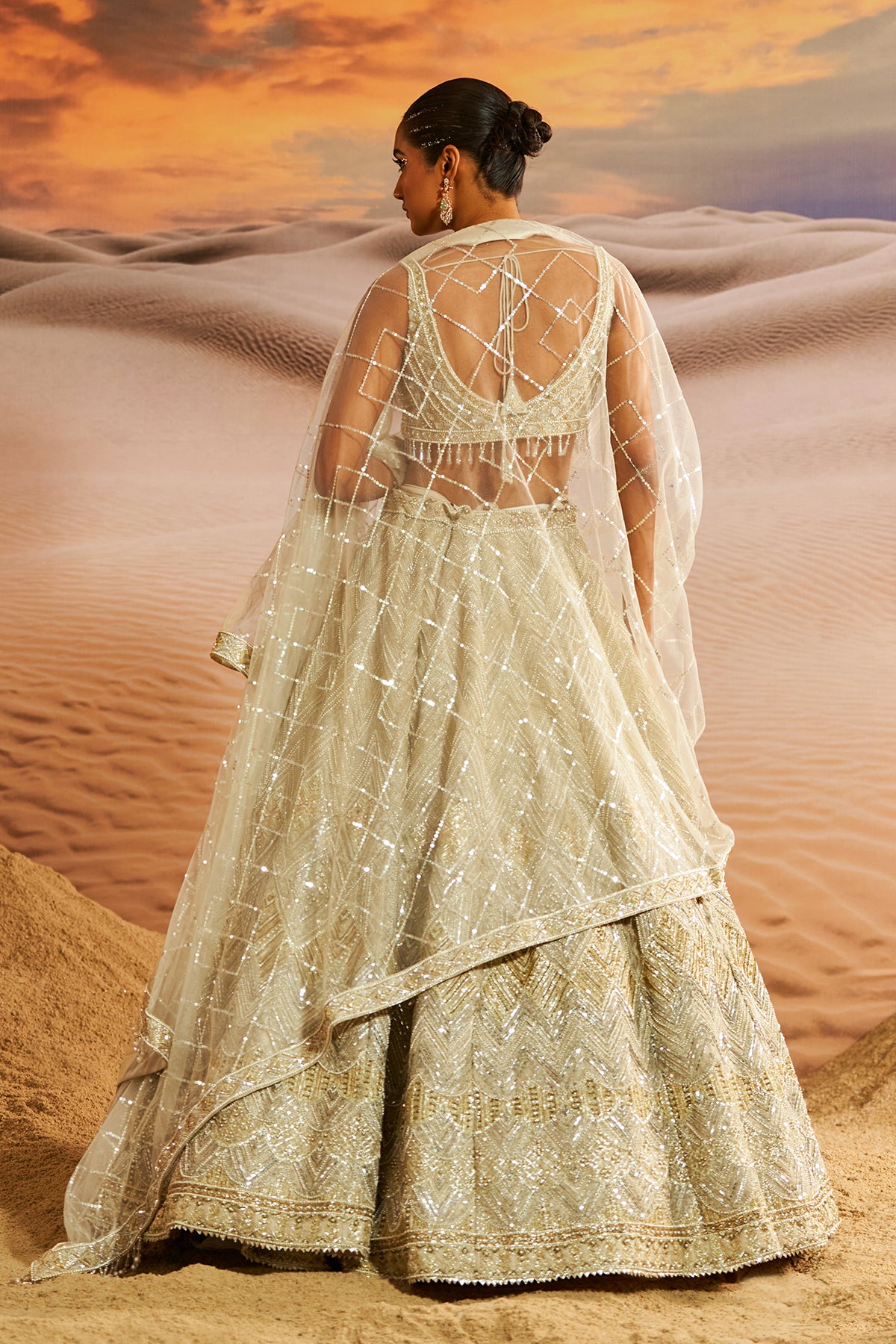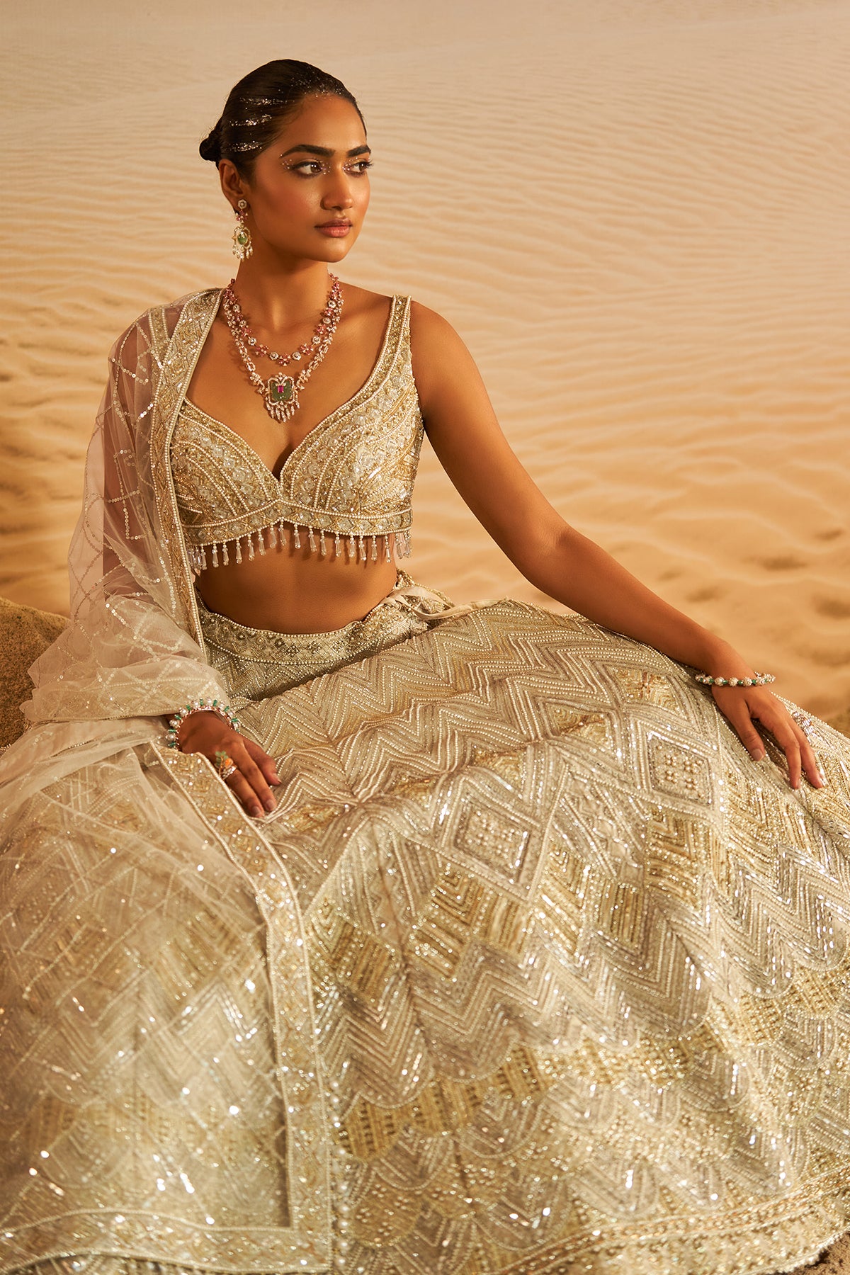 Light Gold Pearl and Multi Shaped Sequin Embelished Lehenga Set, Paired With a Jaal Work Dupatta.