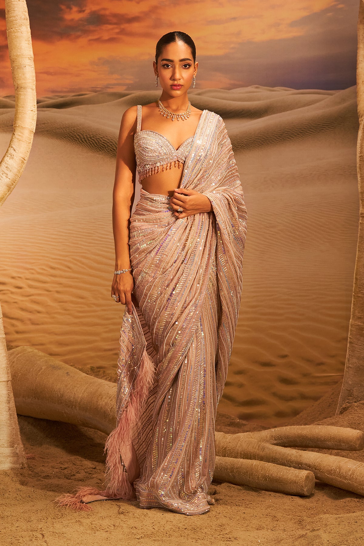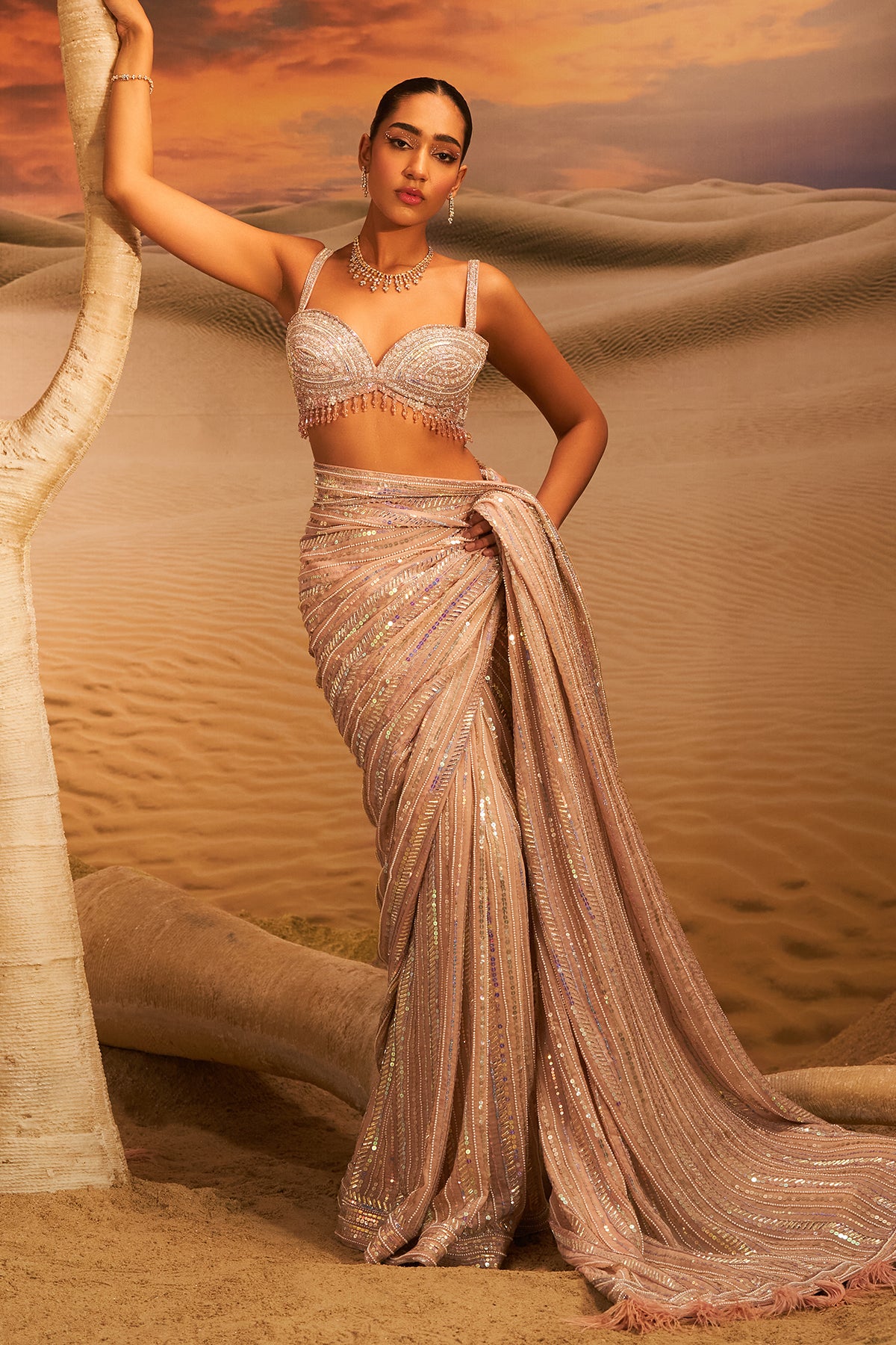 Dusty Pink Saree With Sequin and Pearl Embroidery, Paired With Hand Embelished Blouse With bead tassels.