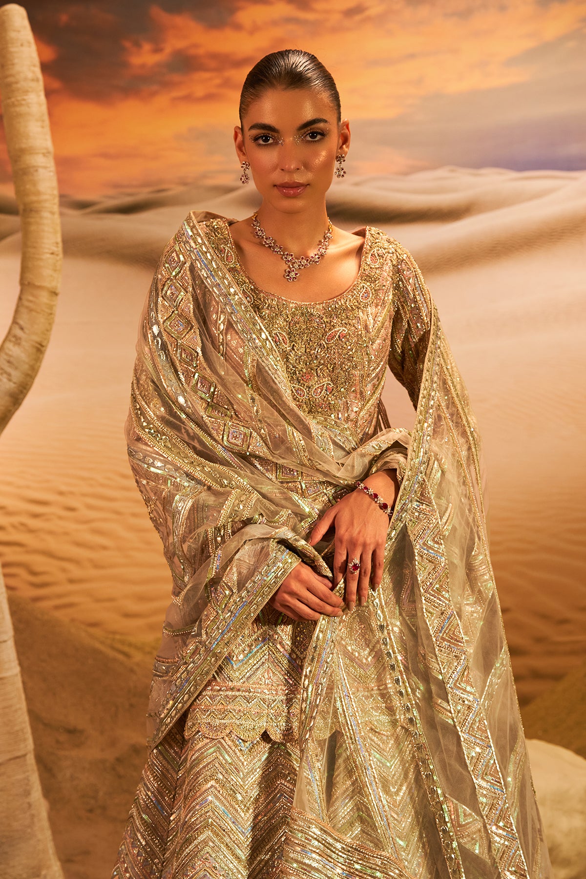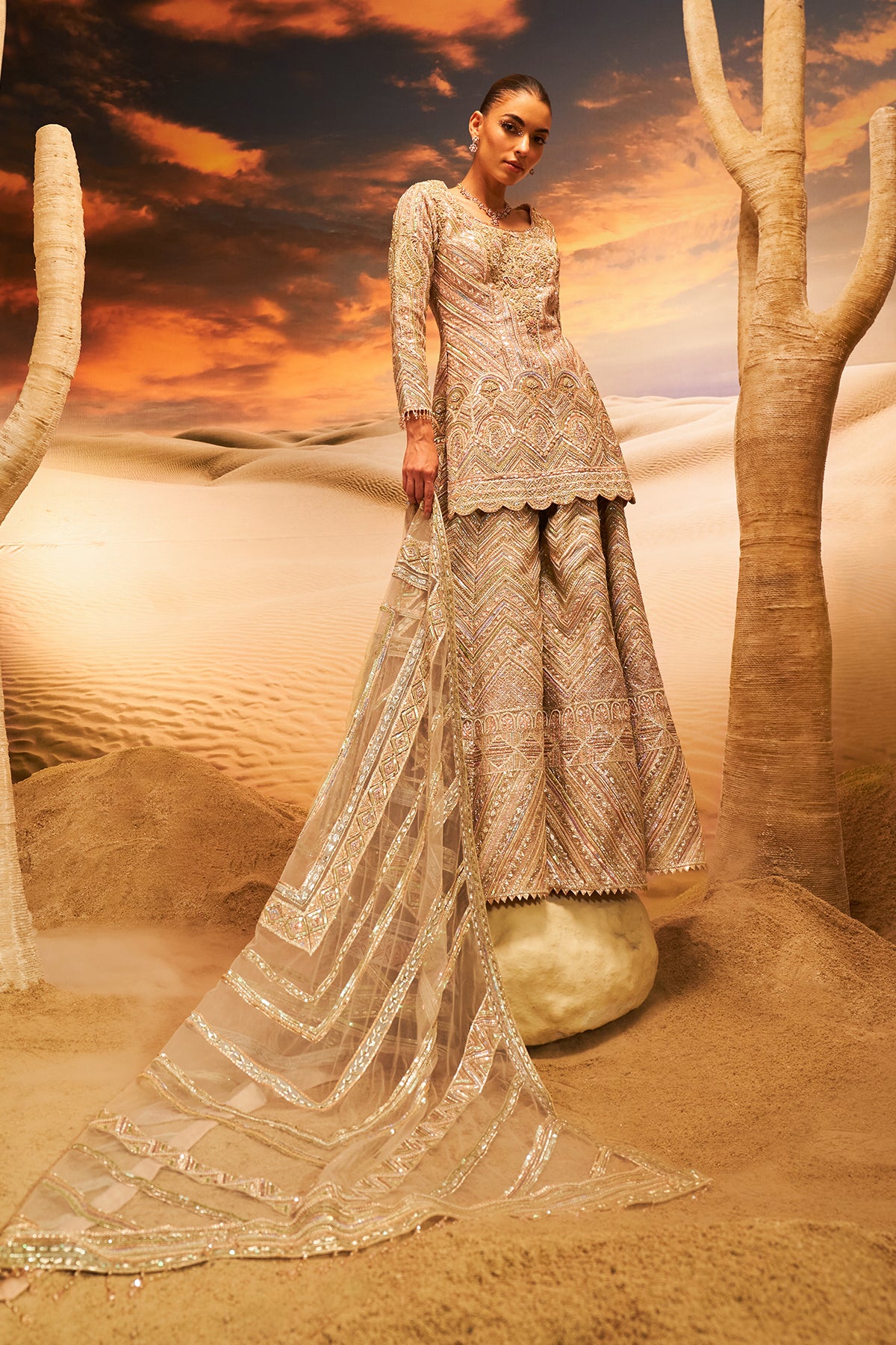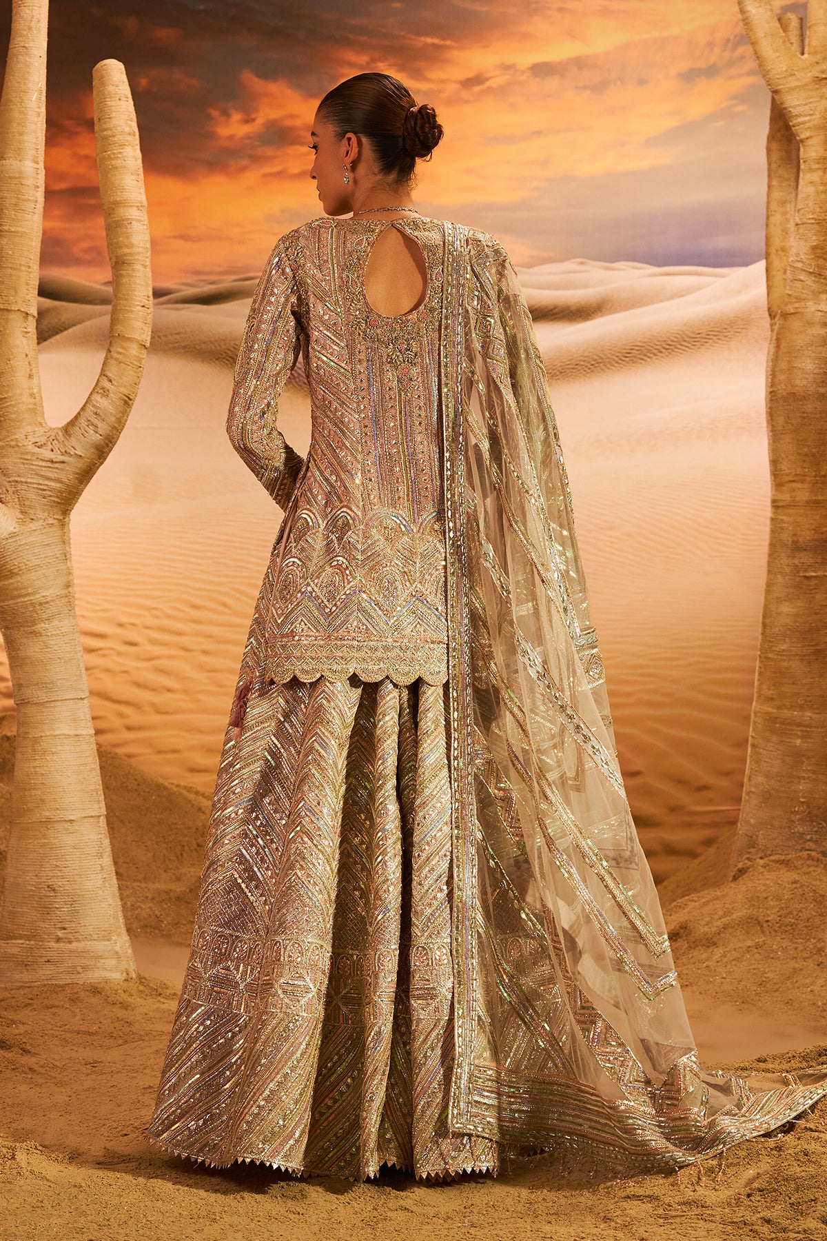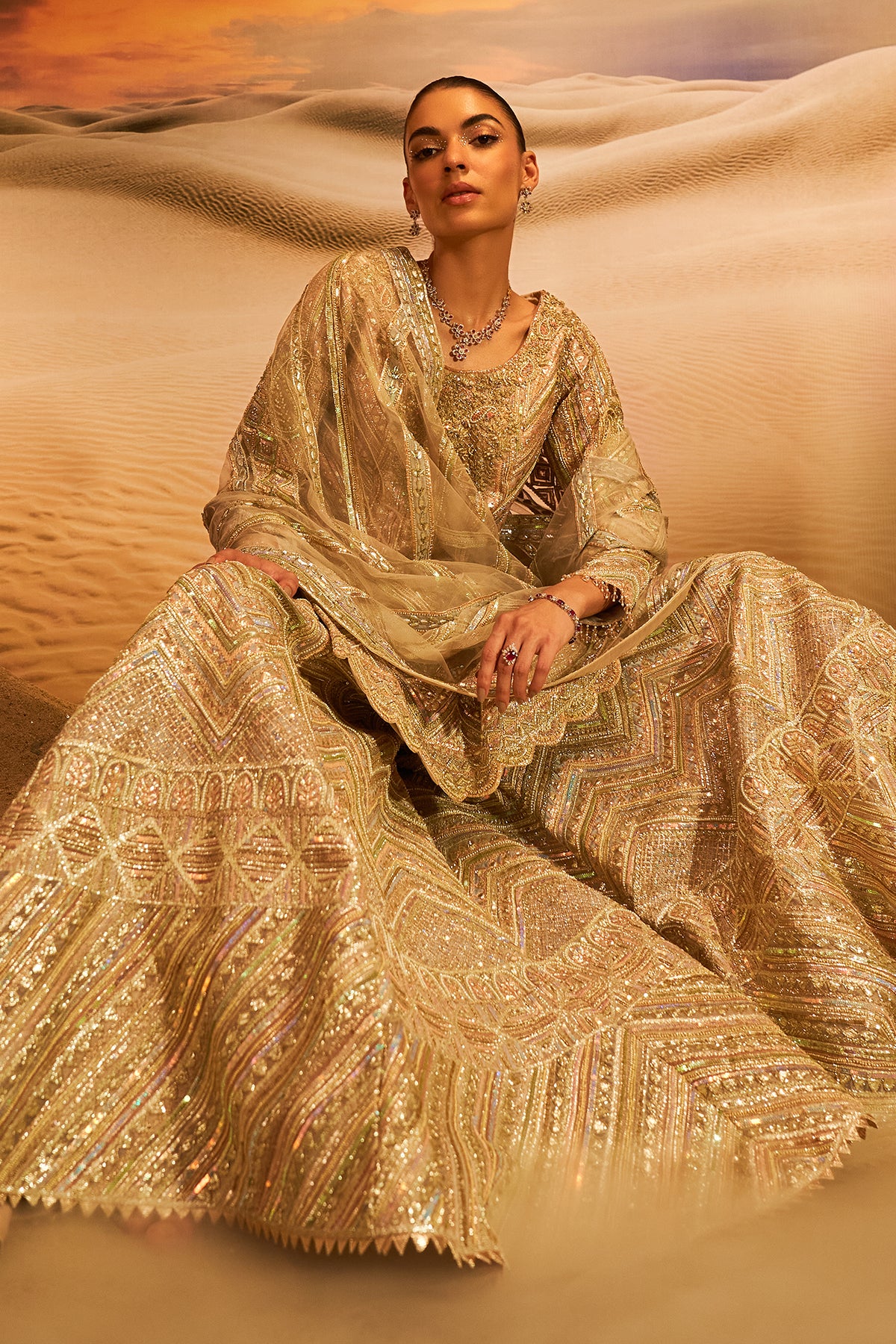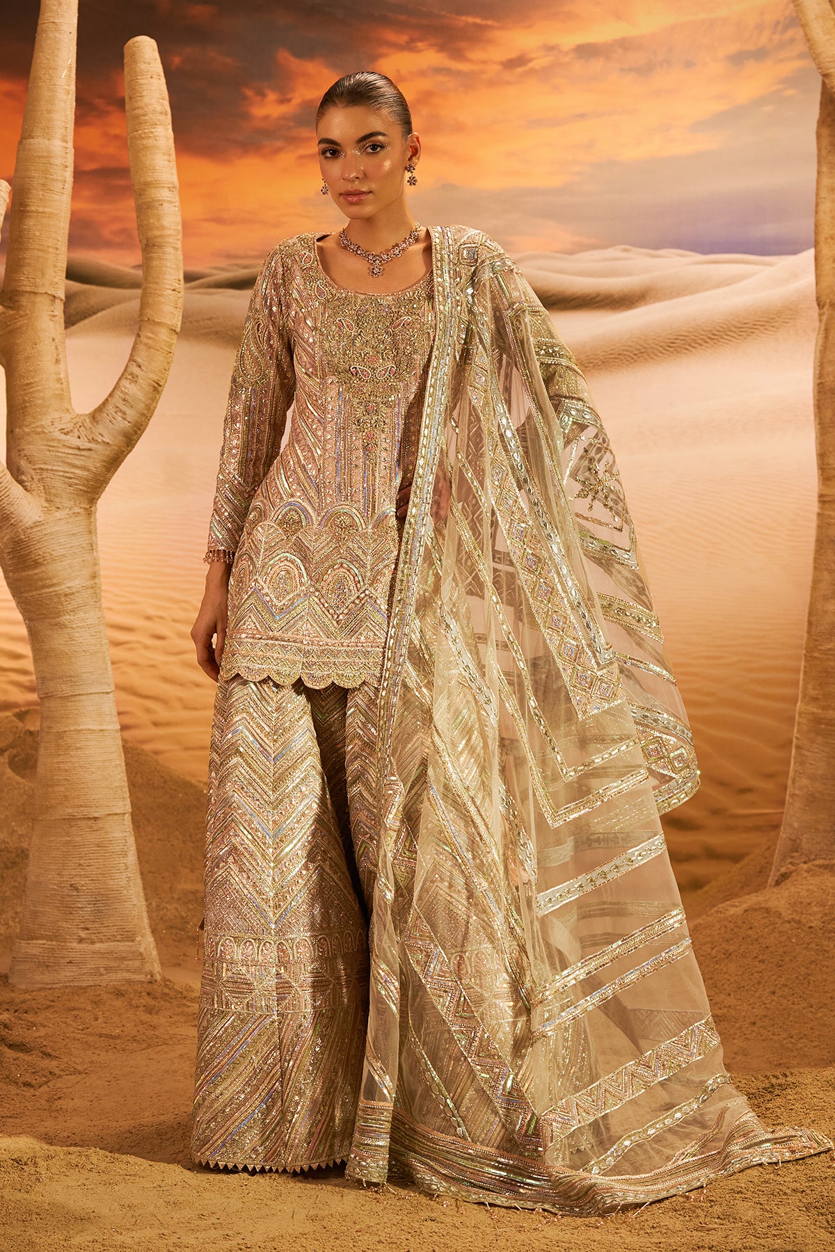 Pale Gold Sharara Paired With a Short Kurta and Dupatta, Embellished With Multiclored Sequins, Gota and Jaal Work Along With Scallop Detailing at the Bottom.